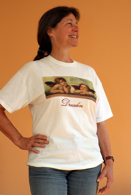 Unsere T-Shirts sind fair produziert und in Sachsen bedruckt worden mit einem Ausschnitt der hoch aufgelösten Vorlage des Originalbildes "Sixtinische Madonna" aus der Gemäldegalerie "Alte Meister", Dresden. Hier können Sie die berühmten Engel von Raffael im Original bewundern - gerne mit Tröster Tours!
